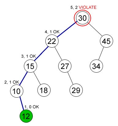 • Bandingkan nilai elemen yang dimasukkan dengan parent. Bila nilai node yang baru saja dimasukkan lebih kecil dari parent, Tukar node dengan parent. Lanjutkan proses ini ke atas sampai nilai parent lebih kecil dari nilai node atau node sudah mencapai root.
